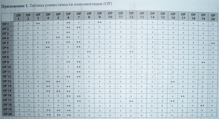 Как пользоваться таблицей: в вертикальном столбце слева выберите олигопептид, подходящий вам по показаниям. Двигаясь по этой горизонтальной строке слева направо, определите, как он сочетается с другими олигопептидами.